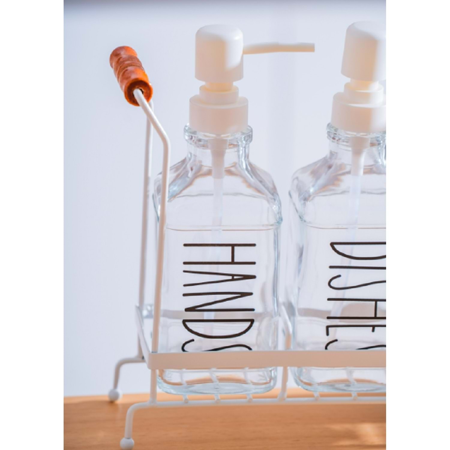 Louvre ikili sıvı sabunluk seti, hem el temizliği hem de bulaşık deteranı için pratik bir çözüm sunar. 500 ml kapasiteli cam şişeleri sayesinde uzun süreli kullanım sağlarken, zarif metal taşıyıcı sepetiyle mutfak tezgâhınızda şıklığı tamamlar.