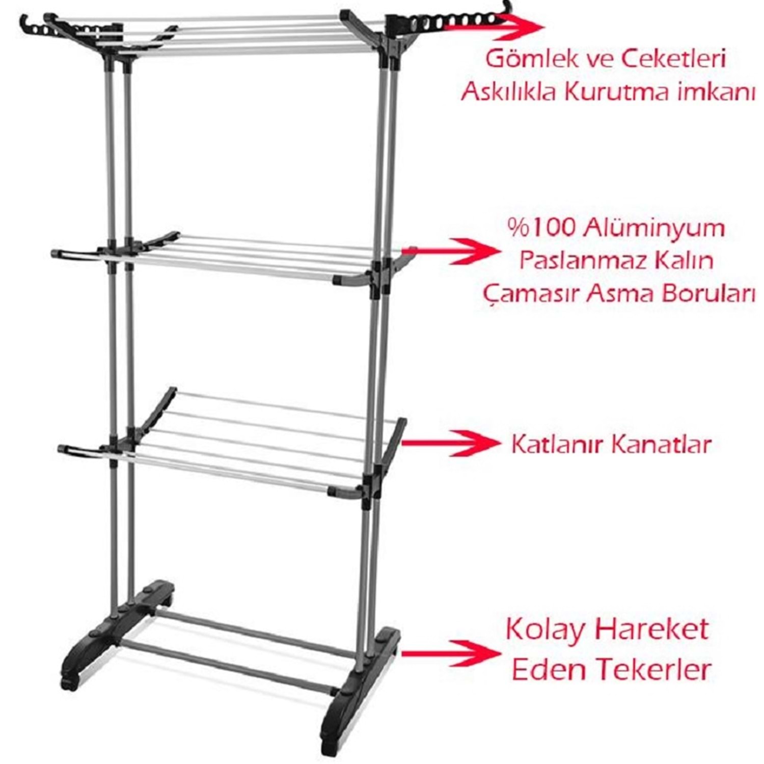 Kolayca katlanır ve taşınabilir. Dayanıklı paslanmaz alüminyum iskelet. Üç katlı az yer kaplayan yapı. Askılı şekilde gömlek kurutmak için özel parça. Yüksek asma kapasitesi ile balkonda çamaşır kurutmak istemeyenler için en iyi çözüm. Ayaklarındaki tekerlekler sayesinde üzerinde çamaşır asılıyken bile rahatça hareket ettirilip taşınabilir. Yer kaplamaz, kullanılmadığı zaman kolayca katlanır ve kaldırılır. Açık haldeki ölçüleri: Genişlik: 76cm / derinlik: 63,5cm / yükseklik: 171 cm. 20 kilogram taşıma kapasitesi. 25 metre asma kapasitesi.
