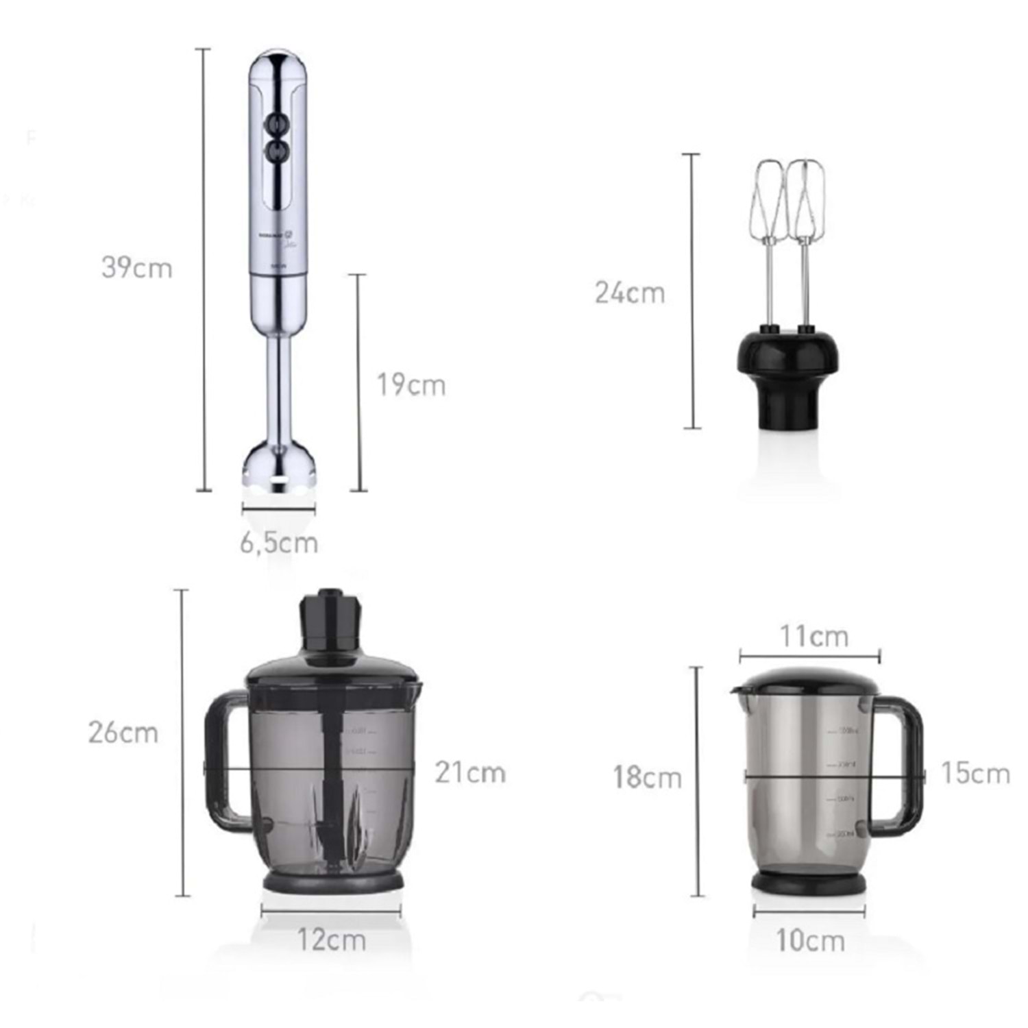 Korkmaz Mia Mega Blender Set, çok yönlü fonksiyonları ve güçlü motoru ile yemek hazırlığını hızlı ve zahmetsiz hale getiriyor. 850 W gücü, 1500 ml doğrayıcı, 1000 ml çırpıcı haznesi ve paslanmaz çelik bıçaklarıyla, karıştırma, çırpma, doğrama ve öğütme işlemlerinde maksimum verim sağlar.