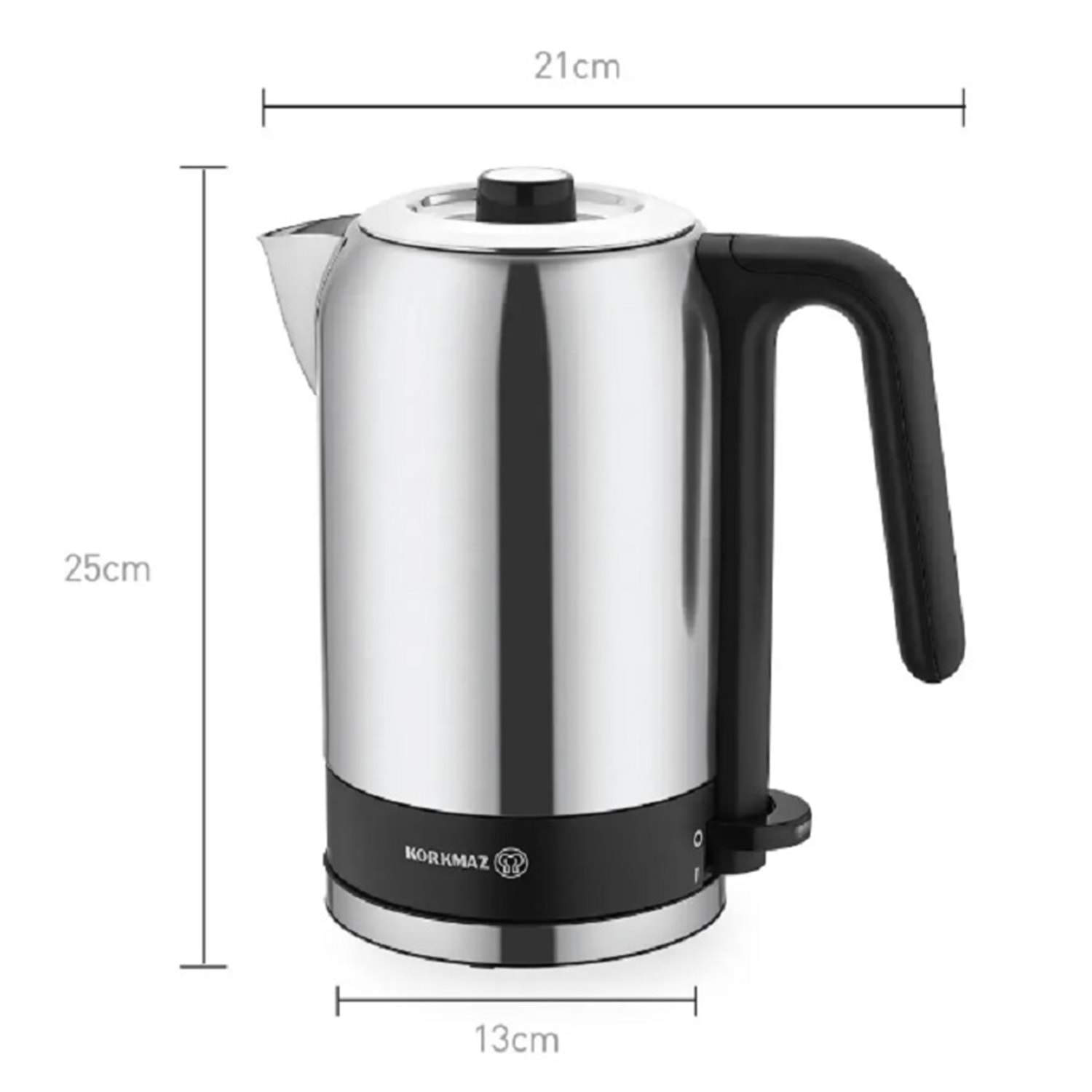 Korkmaz Tria serisinin en geniş hacimli modeliyle, su ısıtma işlemleriniz hızlı ve güvenli olur. Paslanmaz çelik tasarımı, uzun ömür ve hijyen sunarken; kablosuz kullanım kolaylığı sayesinde her köşede rahatlıkla kullanılabilir.