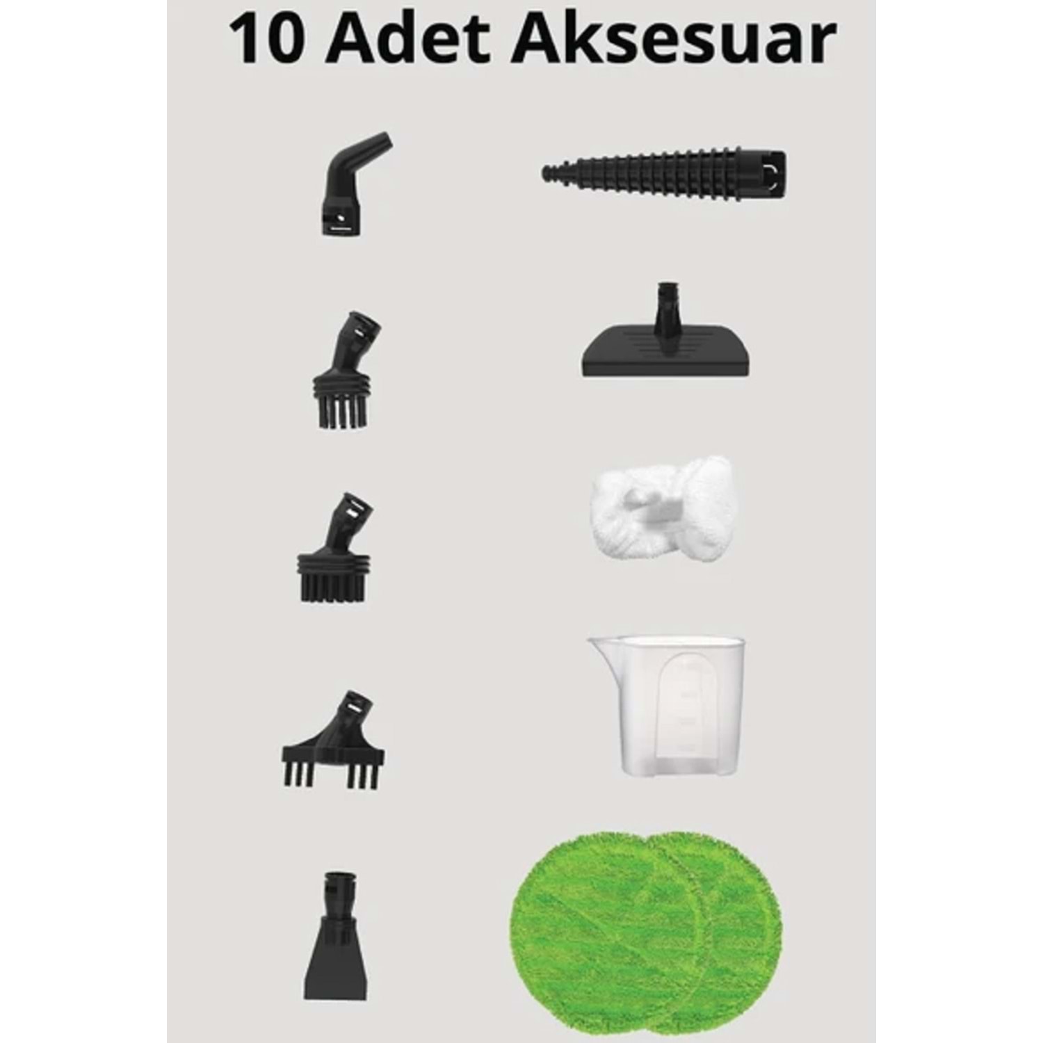 Aksesuarlar; Dairesel çift malzemeli paspas pedi, Kavisli başlık, Büyük yuvarlak fırça, Dar alan temizleme, Cam kazıyıcı, Kazıyıcı başlık, Küçük yuvarlak fırça, Havlu seti, Doğrudan inanma, Ölçüm kayıtları.