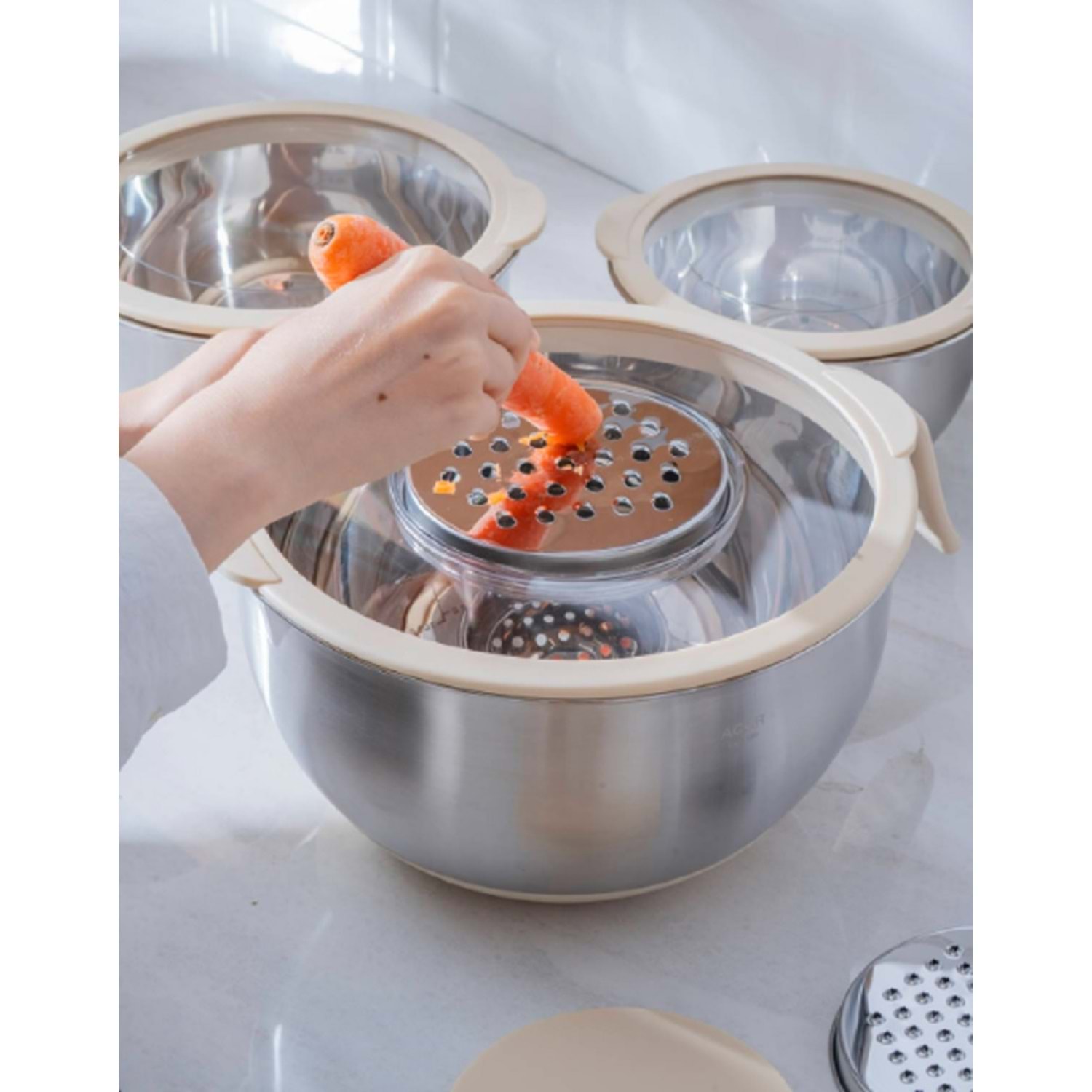 Focus Pro, zamansız tasarımıyla mutfağınıza zarafet katar. 3 boy paslanmaz çelik karıştırma kabı, krem tonlarındaki şeffaf kapakları ile estetik bir görünüm sunarken yiyeceklerinizi taze tutar. Pratik rende aparatları sayesinde doğrudan kap üzerinde rendeleme yapabilir, kaymaz taban ve ergonomik kulp ile güvenli kullanım sağlayabilirsiniz. Karıştırma, saklama ve sunum için tek bir set ile ihtiyacınız olan her şey elinizin altında.